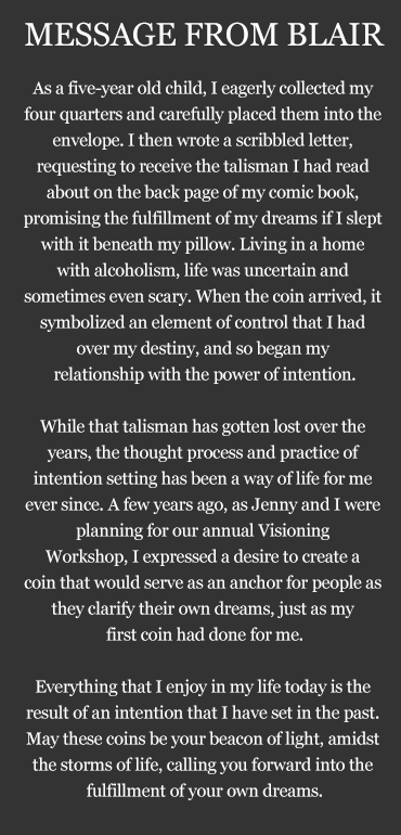May the intention coins and their meditations on abundance, health, love and spirituality, propel you into the life you’ve always dreamed of, powered by vision, passion and faith.