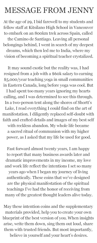 These intention coins and her meditations have been designed with the hope that you too can access the same universal power of intention to achieve your dreams and live your life on purpose.